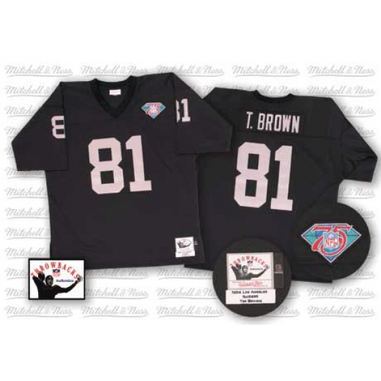 Feel like part of your favorite team by wearing this NFL® Mitchell and Ness Oakland Raiders #81 Tim Brown Black Team Color Authentic NFL Throwback Jersey, made of thick, high-quality Pro-Brite fabric for a genuine gridiron look. The players number which 100% stitched is displayed in tackle twill on the chest, back and sleeves, along with the team name on the front. The players name which 100% stitched is displayed on a sewn-down nameplate at the back. 100% Pro-Brite nylon and 100% Pro-Brite polyester for body, 100% lycratalic spandex dazzle for Side Panels/Collar/Cuffs, NFL® Equipment patch sewn on the bottom of the front collar or fabric insert, NFL® Equipment jock tag with numeric sizing is applied to the lower left bottom of the jersey, Officially licensed