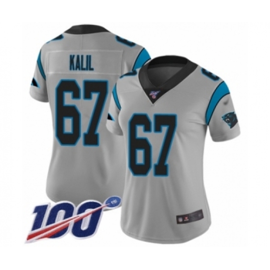 >Women's Carolina Panthers #67 Ryan Kalil Silver Inverted Legend Limited 100th Season Football Jersey