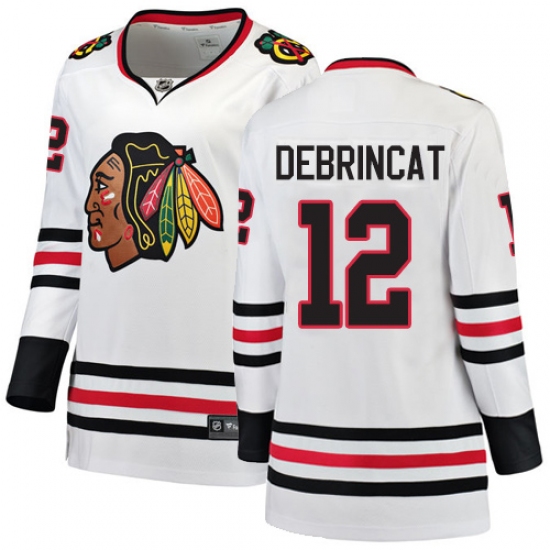 Home>NHL>Chicago Blackhawks>Alex DeBrincat>Women's Chicago Blackhawks #12 Alex DeBrincat Authentic White Away Fanatics Branded Breakaway NHL Jersey