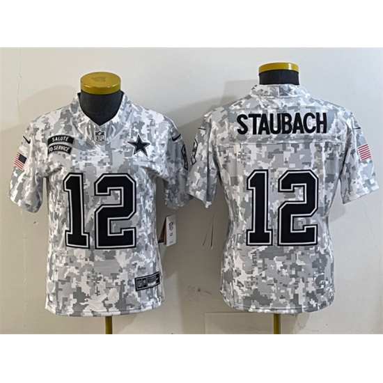 >Women's Dallas Cowboys #12 Roger Staubach 2024 F.U.S.E Arctic Camo Salute To Service Limited Stitched Football Jersey