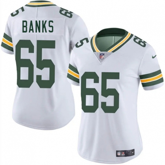>Women's Green Bay Packers #65 Aaron Banks White 2025 Vapor Untouchable Limited Football Stitched Jersey(Run Small)