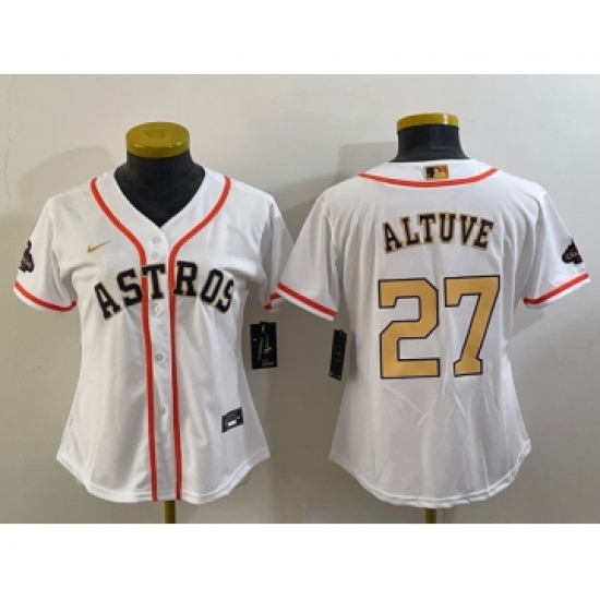 >Women's Houston Astros #27 Jose Altuve 2023 White Gold World Serise Champions Cool Base Stitched Jersey