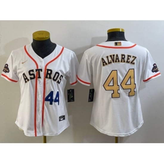 >Women's Houston Astros #44 Yordan Alvarez Number 2023 White Gold World Serise Champions Cool Base Stitched Jersey1