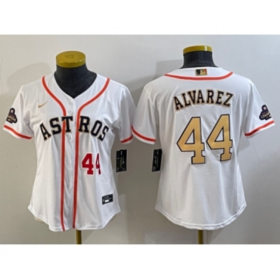 >Women's Houston Astros #44 Yordan Alvarez Number 2023 White Gold World Serise Champions Cool Base Stitched Jerseys