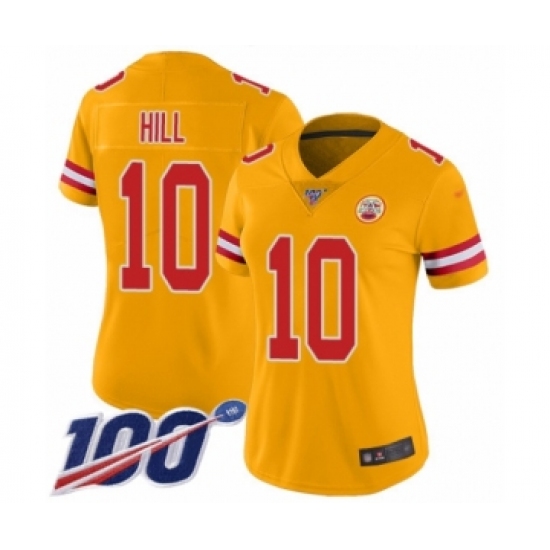 >Women's Kansas City Chiefs #10 Tyreek Hill Limited Gold Inverted Legend 100th Season Football Jersey