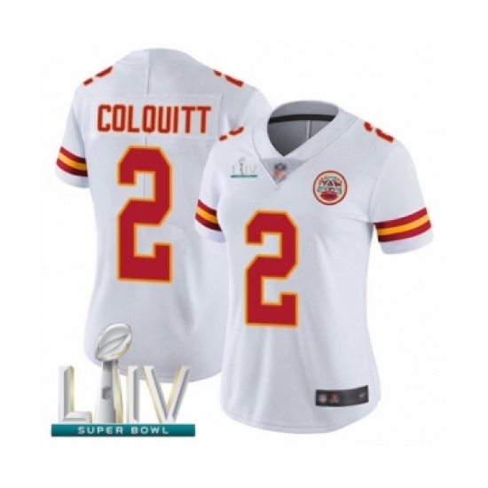 >Women's Kansas City Chiefs #2 Dustin Colquitt White Vapor Untouchable Limited Player Super Bowl LIV Bound Football Jersey
