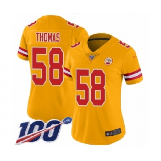 >Women's Kansas City Chiefs #58 Derrick Thomas Limited Gold Inverted Legend 100th Season Football Jersey