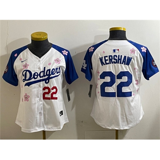 >Women's Los Angeles Dodgers #22 Clayton Kershaw White Royal 2025 Tokyo Series Limited Stitched Baseball Jersey(Run Small)