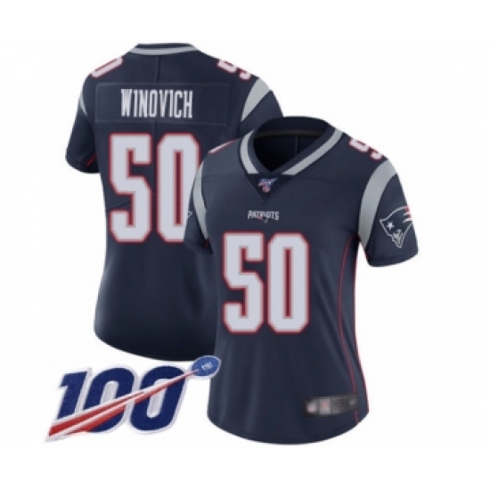 >Women's New England Patriots #50 Chase Winovich Navy Blue Team Color Vapor Untouchable Limited Player 100th Season Football Jersey