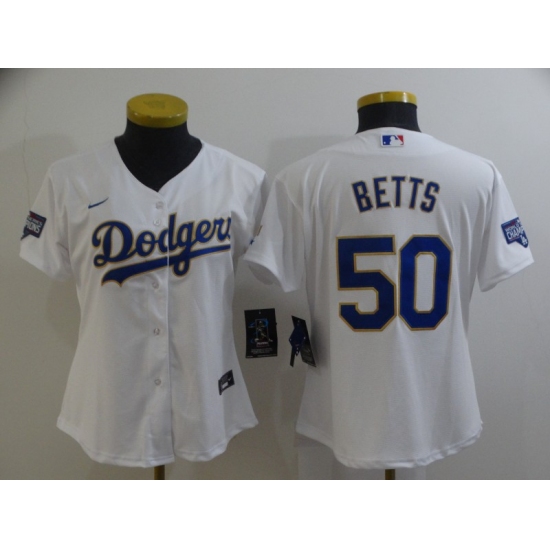 >Women's Nike Los Angeles Dodgers #50 Mookie Betts White Champions Authentic Jersey