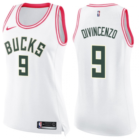 >Women's Nike Milwaukee Bucks #9 Donte DiVincenzo Swingman White Pink Fashion NBA Jersey