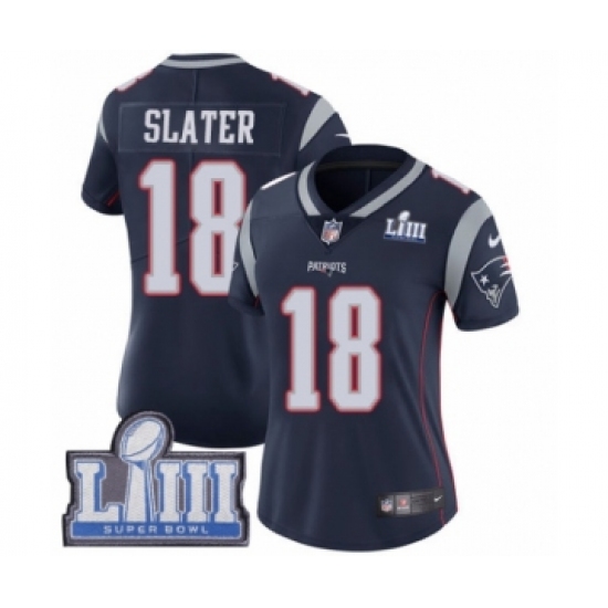 >Women's Nike New England Patriots #18 Matthew Slater Navy Blue Team Color Vapor Untouchable Limited Player Super Bowl LIII Bound NFL Jersey