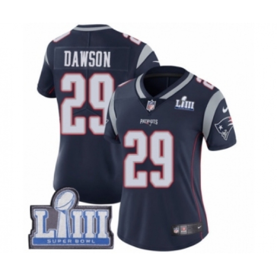 >Women's Nike New England Patriots #29 Duke Dawson Navy Blue Team Color Vapor Untouchable Limited Player Super Bowl LIII Bound NFL Jersey