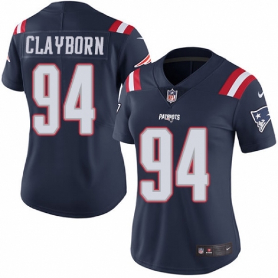 >Women's Nike New England Patriots #94 Adrian Clayborn Limited Navy Blue Rush Vapor Untouchable NFL Jersey