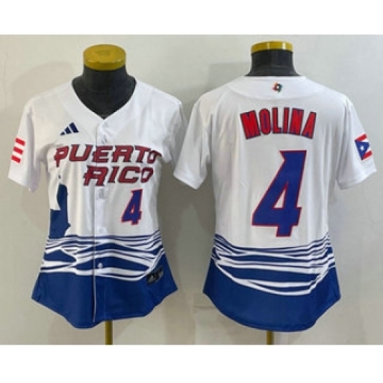 >Women's Puerto Rico Baseball #4 Yadier Molina Number 2023 Red World Classic Stitched Jerseys