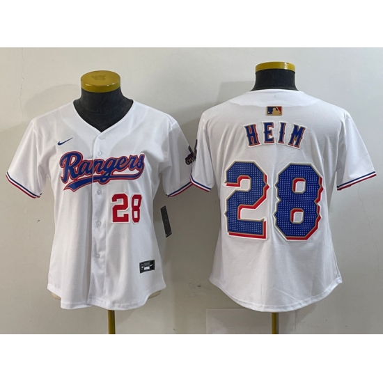 Women's Texas Rangers #28 Jonah Heim Nike White Home 2023 World Series Champions Replica Player Jersey