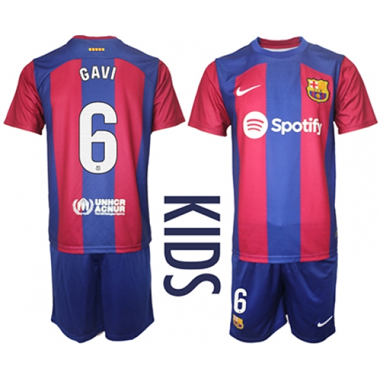 >Youth Barcelona #6 Gavi Blue Red 2023-24 Home Soccer Jersey