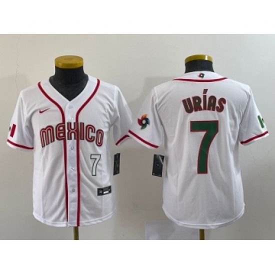 >Youth Mexico Baseball #7 Julio Urias Number 2023 Red World Baseball Classic Stitched Jersey 4