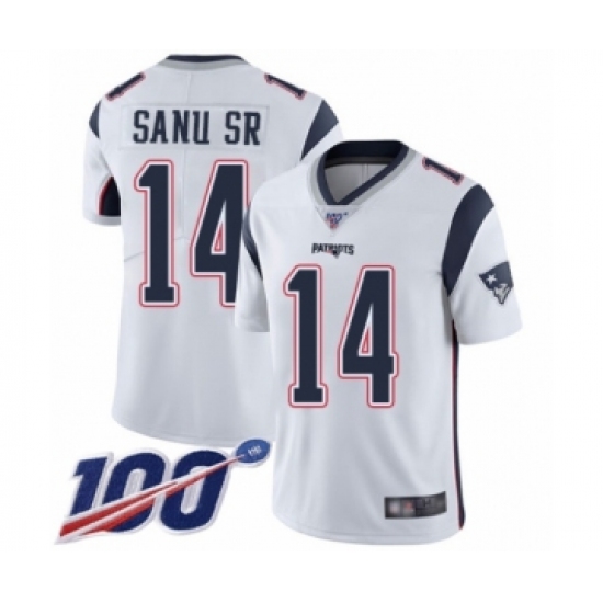 >Youth New England Patriots #14 Mohamed Sanu Sr White Vapor Untouchable Limited Player 100th Season Football Jersey