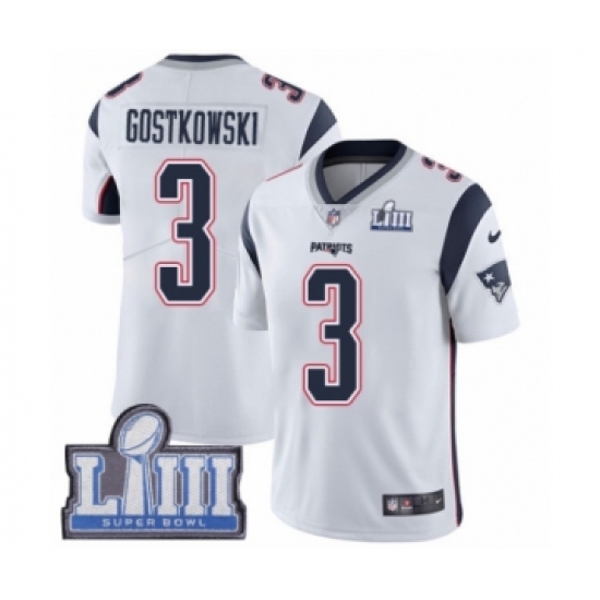 >Youth Nike New England Patriots #3 Stephen Gostkowski White Vapor Untouchable Limited Player Super Bowl LIII Bound NFL Jersey