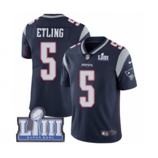 >Youth Nike New England Patriots #5 Danny Etling Navy Blue Team Color Vapor Untouchable Limited Player Super Bowl LIII Bound NFL Jersey