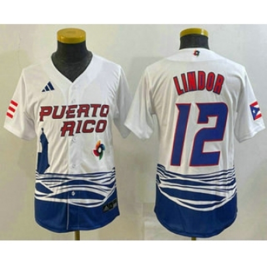 >Youth Puerto Rico Baseball #12 Francisco Lindor 2023 White World Baseball Classic Stitched Jersey