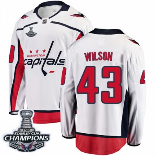 >Youth Washington Capitals #43 Tom Wilson Fanatics Branded White Away Breakaway 2018 Stanley Cup Final Champions NHL Jersey