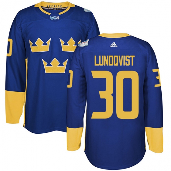 Men's Adidas Team Sweden #30 Henrik Lundqvist Authentic Royal Blue Away 2016 World Cup of Hockey Jersey