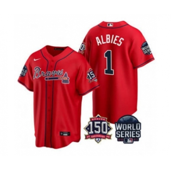 Men's Atlanta Braves #1 Ozzie Albies 2021 Red World Series With 150th Anniversary Patch Cool Base Baseball Jersey