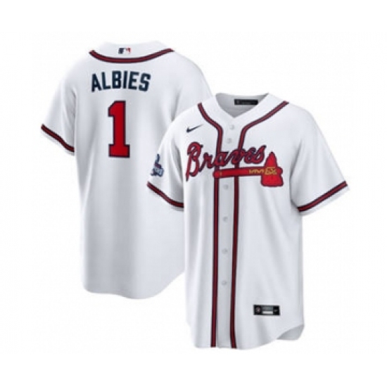 Men's Atlanta Braves #1 Ozzie Albies 2021 White World Series Champions Cool Base Stitched Jersey