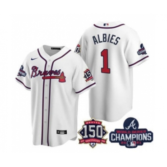 Men's Atlanta Braves #1 Ozzie Albies 2021 White World Series Champions With 150th Anniversary Patch Cool Base Stitched Jersey