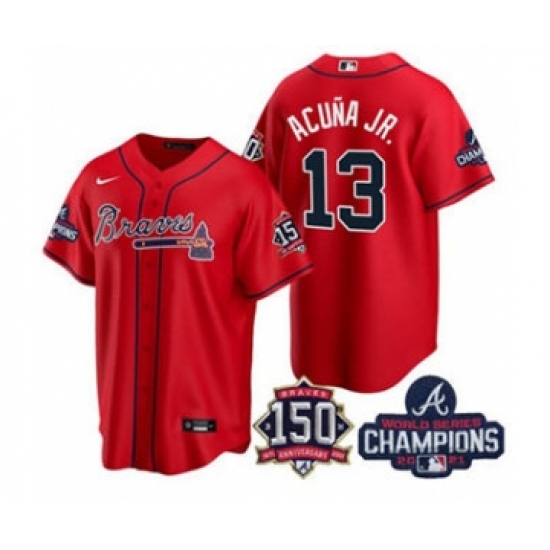 Men's Atlanta Braves #13 Ronald Acuna Jr. 2021 Red World Series Champions With 150th Anniversary Patch Cool Base Stitched Jersey