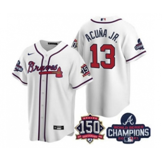 Men's Atlanta Braves #13 Ronald Acuna Jr. 2021 White World Series Champions With 150th Anniversary Patch Cool Base Stitched Jersey