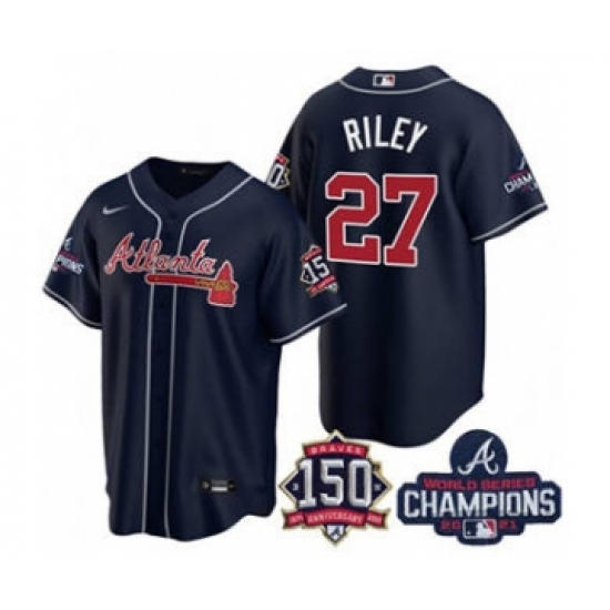 >Men's Atlanta Braves #27 Austin Riley 2021 Navy World Series Champions With 150th Anniversary Patch Cool Base Stitched Jersey