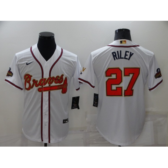 >Men's Atlanta Braves #27 Austin Riley Nike White 2022 Gold Program Authentic Player Jersey