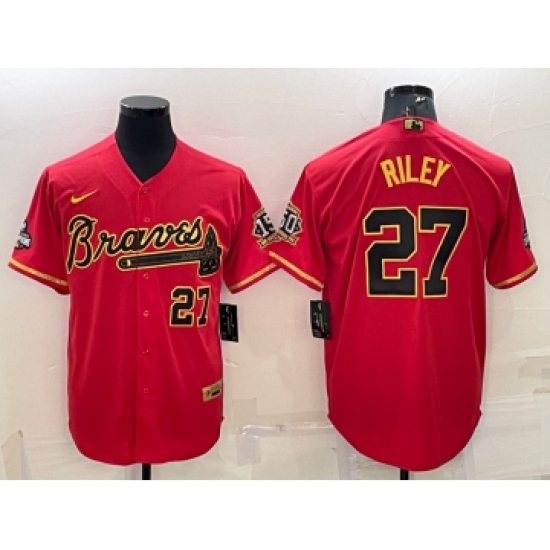 Men's Atlanta Braves #27 Austin Riley Red Gold World Series Champions Program Cool Base Stitched Baseball Jersey