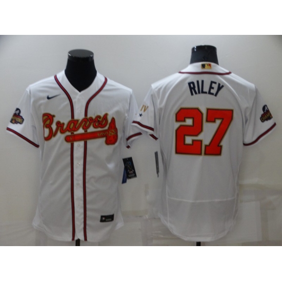 >Men's Atlanta Braves #27 Austin Riley White 2022 Gold Program Authentic Player Jersey