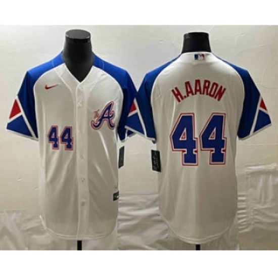 >Mens Atlanta Braves #44 Hank Aaron Number White 2023 City Connect Cool Base Stitched Jersey