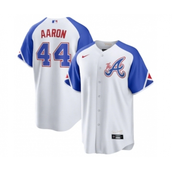 Men's Atlanta Braves #44 Hank Aaron White 2023 City Connect Cool Base Stitched Baseball Jersey