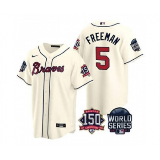 Men's Atlanta Braves #5 Freddie Freeman 2021 Cream World Series With 150th Anniversary Patch Cool Base Baseball Jersey