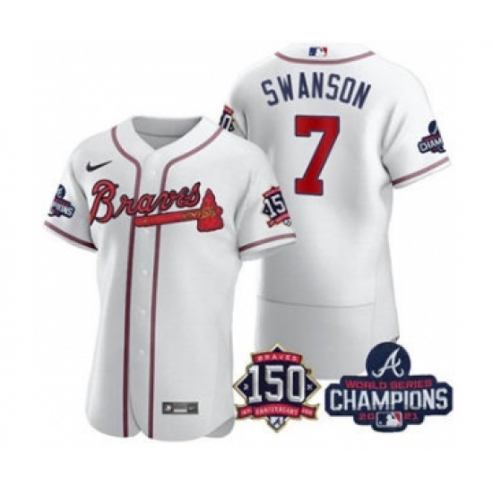 Men's Atlanta Braves #7 Dansby Swanson 2021 White World Series Champions With 150th Anniversary Flex Base Stitched Jersey
