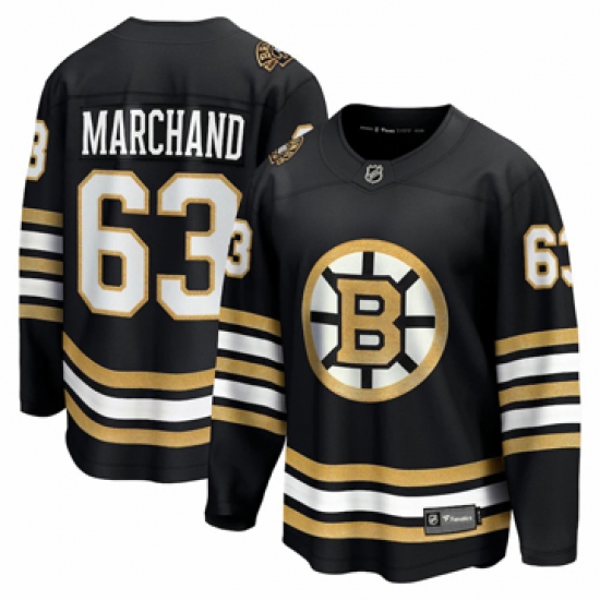 >Men's Boston Bruins #63 Brad Marchand Fanatics Branded Black 100th Anniversary Premier Breakaway Player Jersey