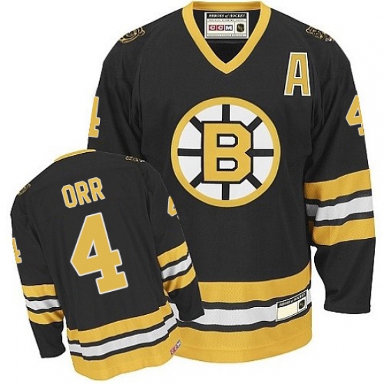 Men's CCM Boston Bruins #4 Bobby Orr Authentic Black/Gold Throwback NHL Jersey