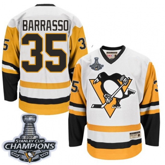 Men's CCM Pittsburgh Penguins #35 Tom Barrasso Authentic White Throwback 2017 Stanley Cup Champions NHL Jersey