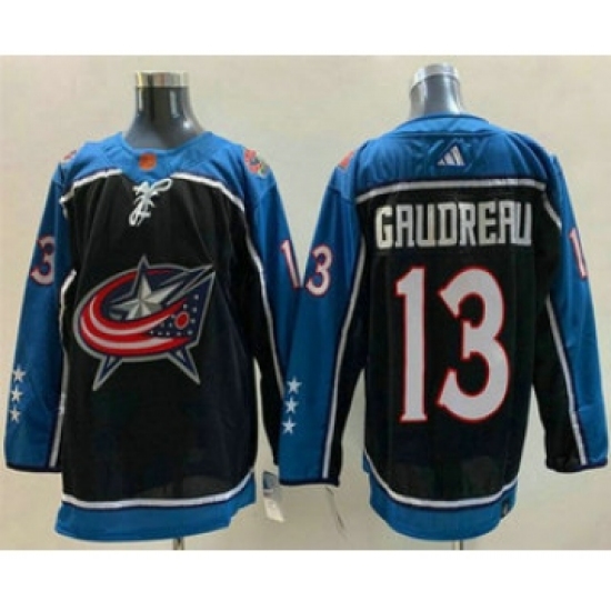 >Men's Columbus Blue Jackets #13 Johnny Gaudreau Black 2022 Reverse Retro Stitched Jersey