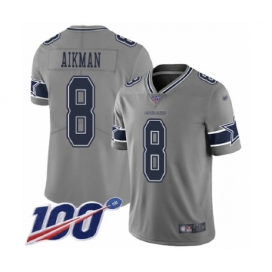 >Men's Dallas Cowboys #8 Troy Aikman Limited Gray Inverted Legend 100th Season Football Jersey