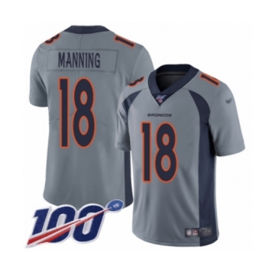 Men's Denver Broncos #18 Peyton Manning Limited Silver Inverted Legend 100th Season Football Jersey