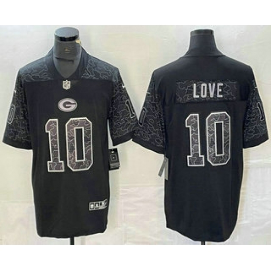>Men's Green Bay Packers #10 Jordan Love Black Reflective Limited Stitched Football Jersey