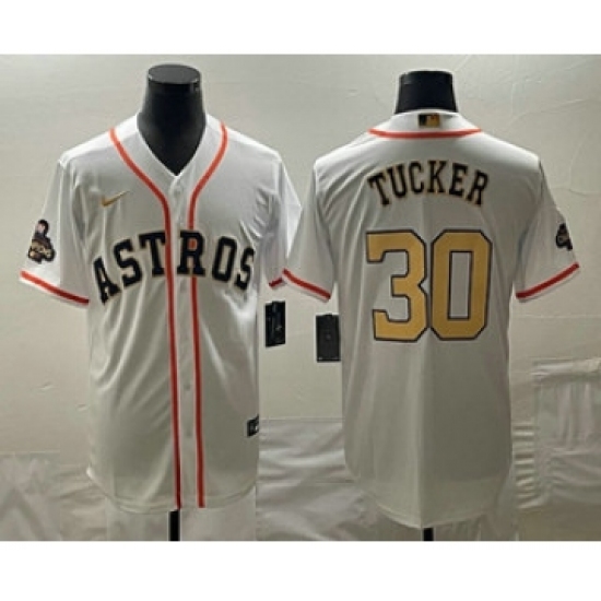 Men's Houston Astros #30 Kyle Tucker Number 2023 White Gold World Serise Champions Flex Base Stitched Jersey1