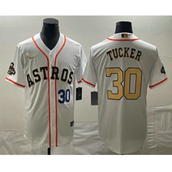 Men's Houston Astros #30 Kyle Tucker Number 2023 White Gold World Serise Champions Cool Base Stitched Jersey